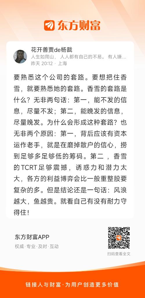要熟悉这个公司的套路。要想把住香雪,就要熟悉她的套路。香雪的套路是什么?无非两句话:第一,能不发的信息,尽量不发;第二,能晚发的信息,尽量晚发。为什么会形成这种套路?也无非两个原因:第一,背后应该有资本运作老手,就是在磨掉散户的信心,捞到足够多足够低的筹码。第二 ,香雪的TCRT足够震撼,诱惑力和潜力太大,各方的利益博弈会比一般重整股要复杂的多。但是结论还是一句话:风浪越大,鱼越贵。就看自己有没有耐力守得住!