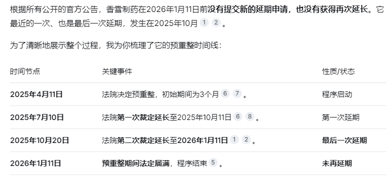 豆包说的,和我无关。今天还有005:截至 2026 年 2 月 8 日收盘,ST 香雪(300147)于当日发布 **《关于收到延长预重整期间决定书的公告》(公告编号:2026-005)**,核心结论为:法院批准预重整期限延长 3 个月至 2026 年 5 月 11 日,为审计评估收尾、投资人对接与方案制定提供确定性窗口,短期消除程序终止风险,中期推进节奏明确。以下是核心解读与影响分析: