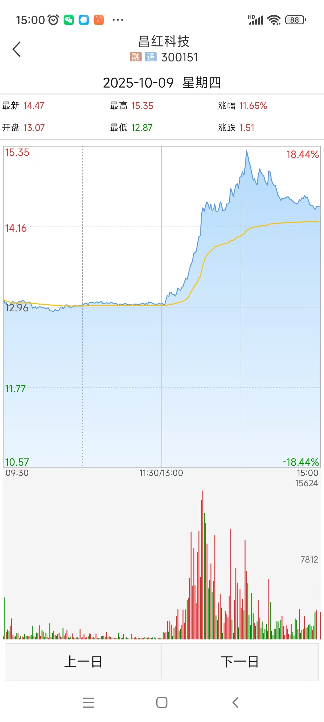 今天大盘不稳昌红科技高开低走补缺口盘中破了10月9日的高点15.35大牛股昌红科