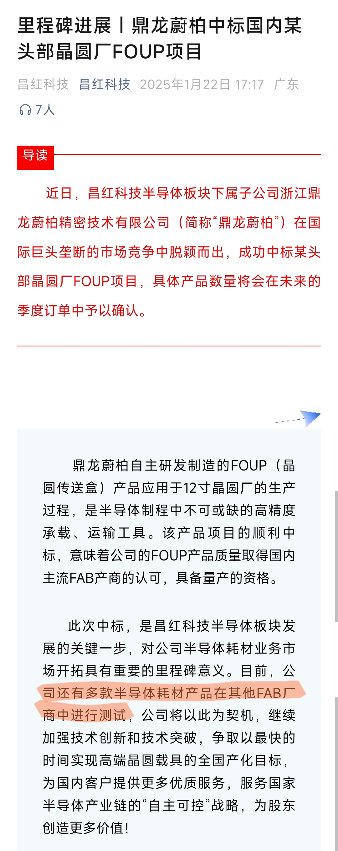 去年一月的消息:除了晶圆载具传送盒昌红科技鼎龙蔚柏还有多款半导体耗材产品在测试中