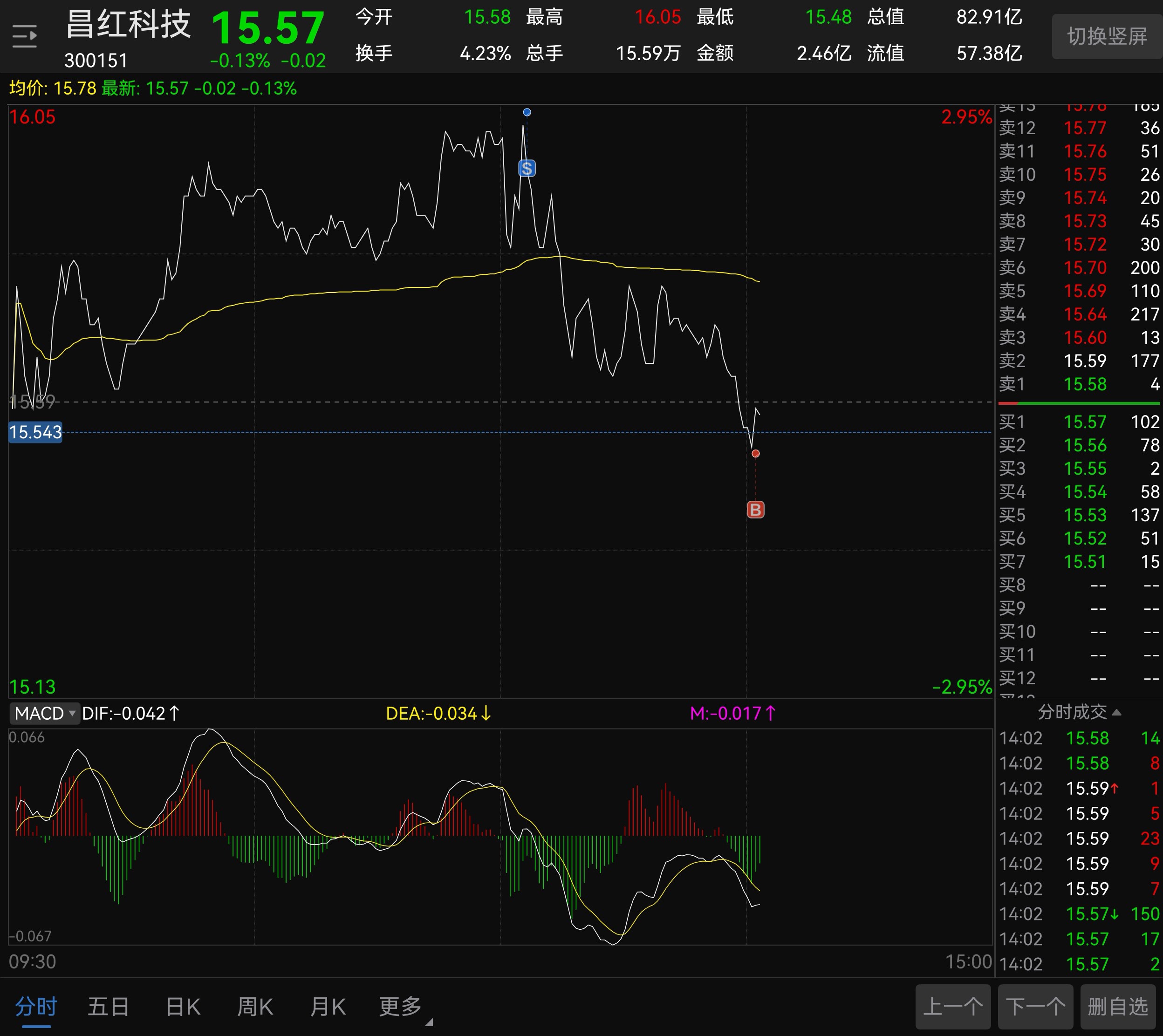 $昌红科技(SZ300151)$ 早盘挂单未成交。后面几天15.5左右还会有,继续加仓。