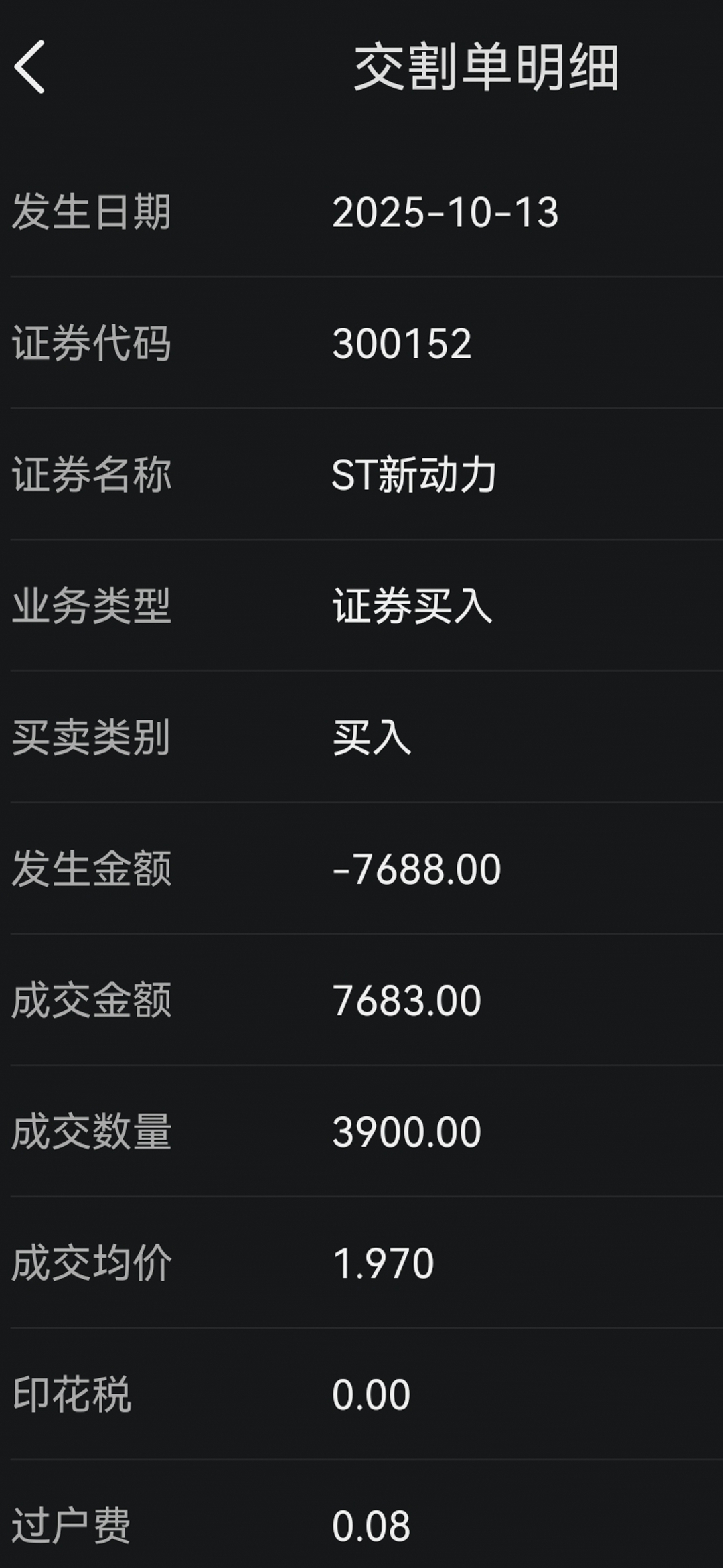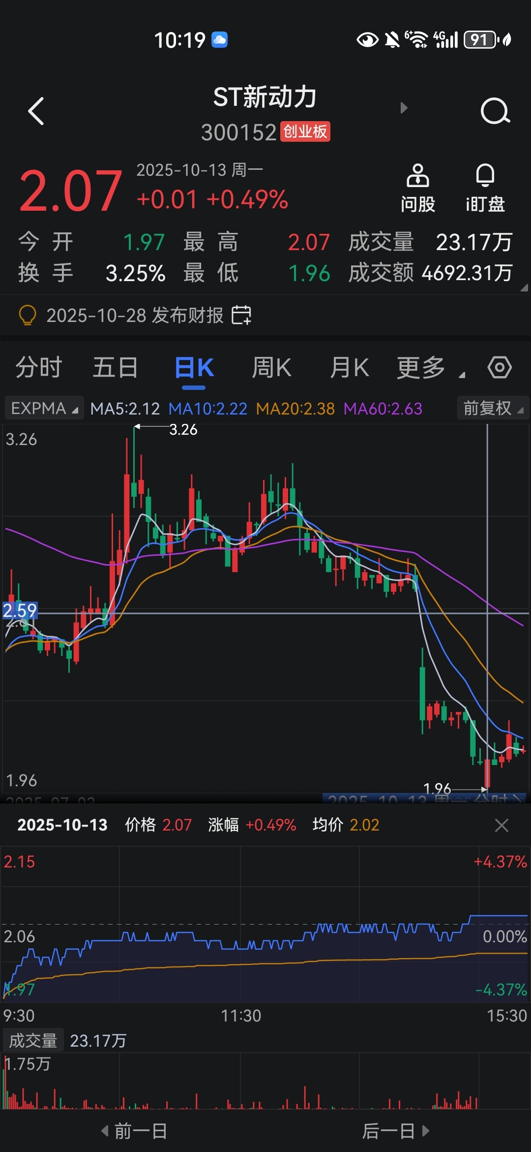 $ST新动力(SZ300152)$ 回看之前开始介入发帖新动力,10月12号在很多人看跌停的时候还是发帖预测13号应该收红盘,所以自己1.97开始介入新动力,虽然回看最低点是1.96,但是1.96不容易买到,但是那个1.97成本现在回看也可以了,然后做了几次T 感觉买卖点也还可以,其实回看很多预测准度还可以吧