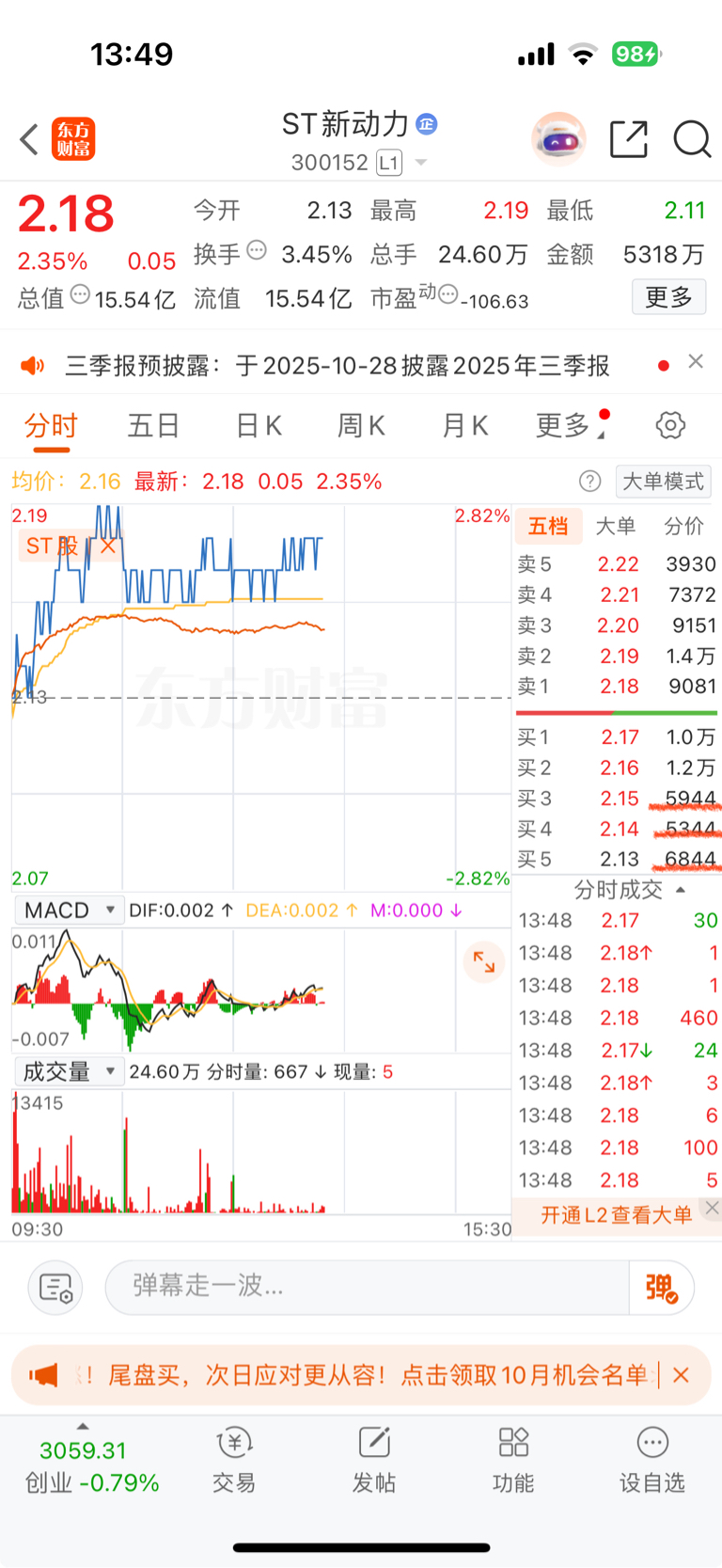 $ST新动力(SZ300152)$ 44出现在买档,之前大涨时也出现过几次,这次应该是要启动了