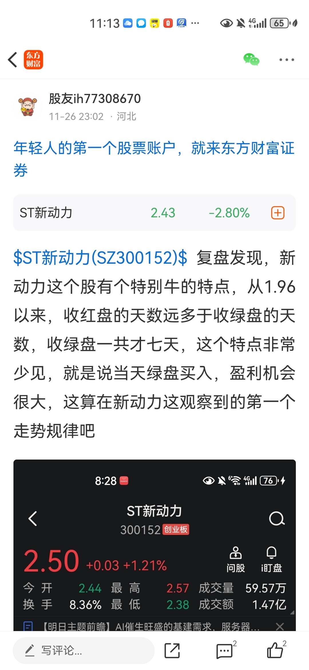 $ST新动力(SZ300152)$ 新动力,低点逐渐抬高,之前2.38然后到今天2.41 而且观察发现新动力最近收红盘的天数巨多