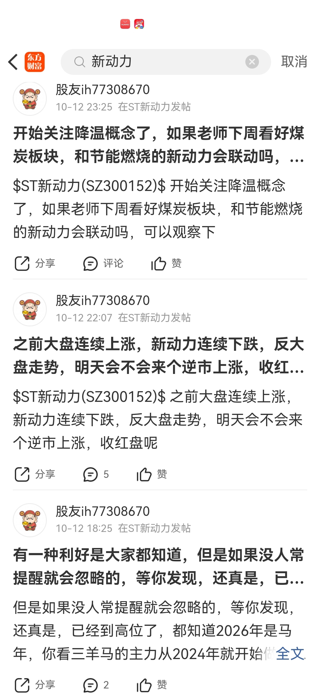 $ST新动力(SZ300152)$ 今天新动力吧里基本又全是看空,还记得10月12号那天吗,当时也是一堆人说,13号要跌停了,当天只有本人发帖预测,新动力10月13号会收红盘,吧里看空不用管,今天是强行下跌9个点左右,为了画走势线,明天还是预测新动力收红盘,明天收盘看看