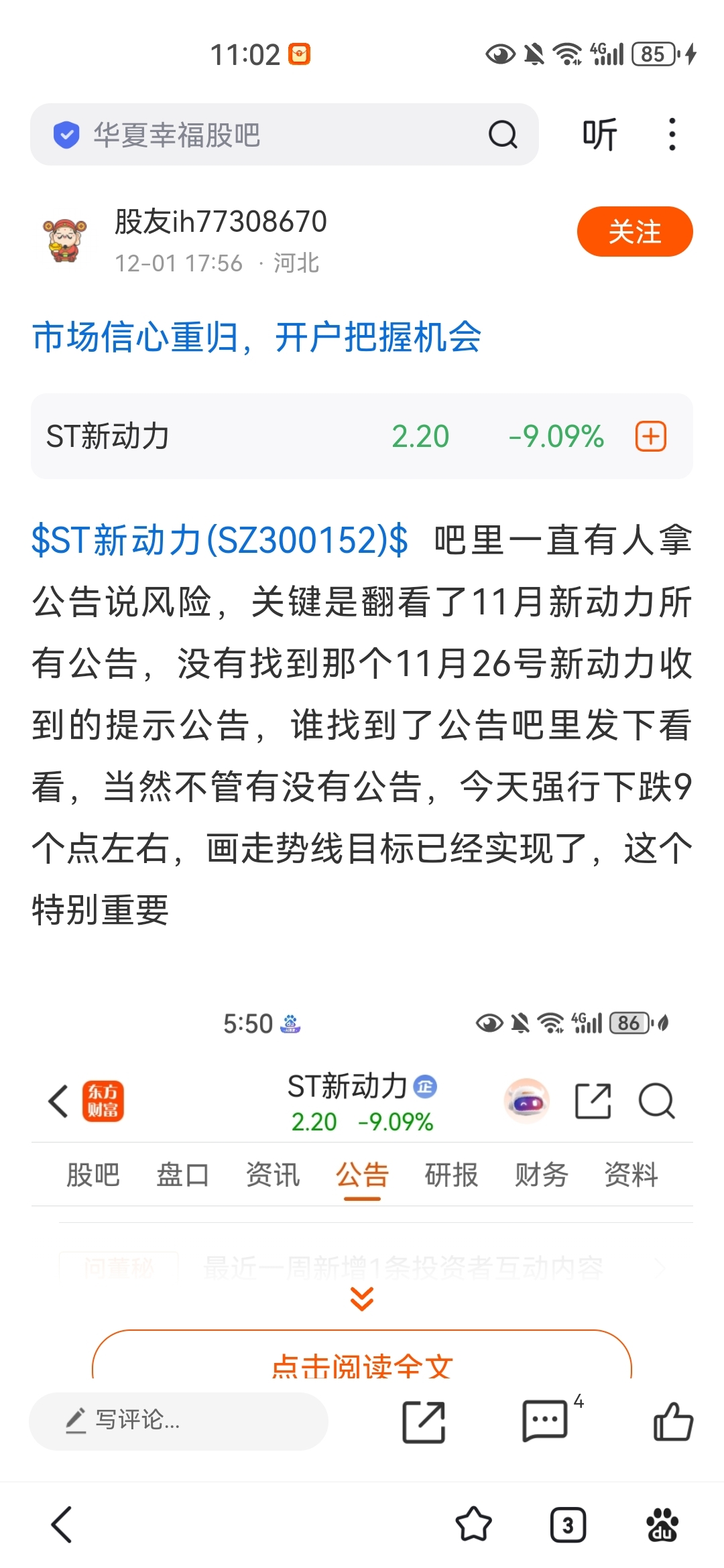 $ST新动力(SZ300152)$ 吧里现在又开始说哪个平台又搞错了已经改了,当时早就发帖说了,你就看11月26号不是说收到了公告了,你反问那个公告在哪呢,根本就没有公告怎么收到公告,这不纯粹浪费精力吗,有时间还不如多研究下,明天的操作策略