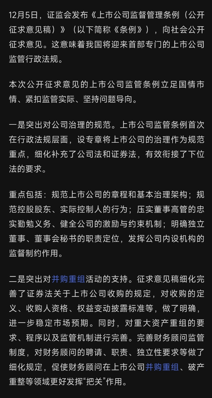 1)证监会就《上市公司监督管理条例》公开征求意见,突出对并购重组的支持。2)央视