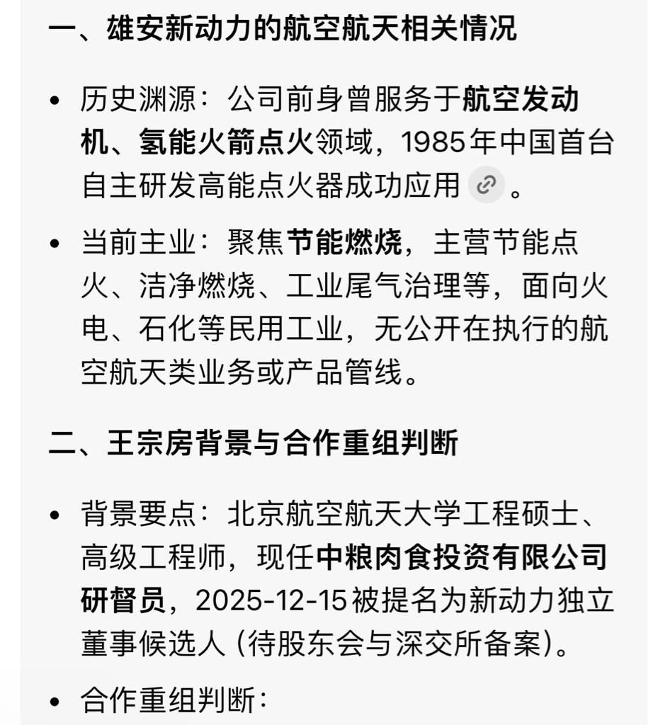 雄安新动力有航空航天相关技术渊源;中粮或航空相关公司的王宗房与新动力合作: