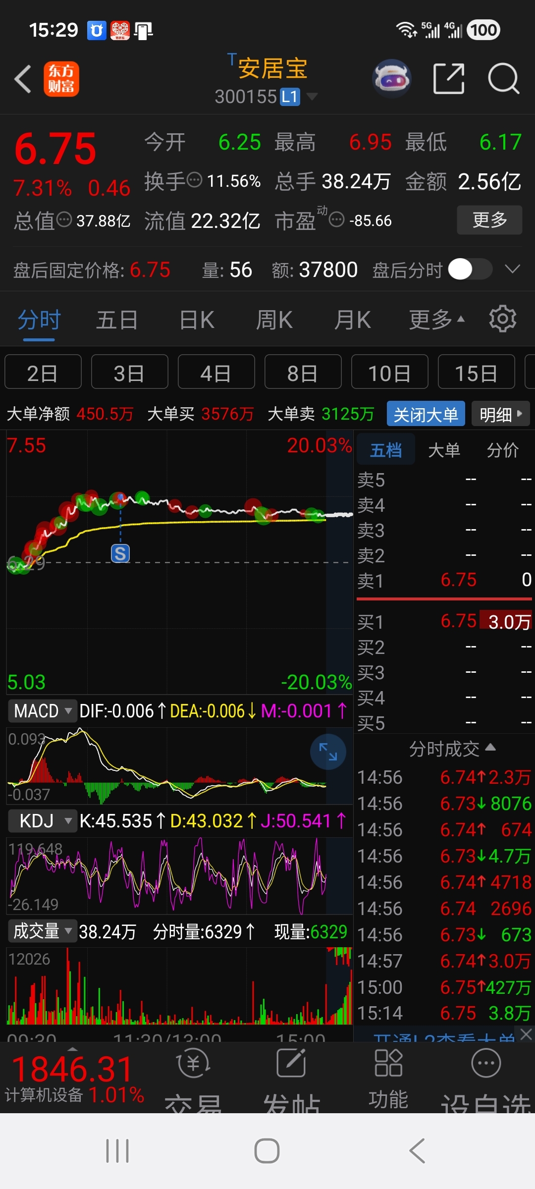 $安居宝(SZ300155)$ 6.92跑了一半,我会后悔吗。本来想等过前高7.22再看情况的。5.35的本。