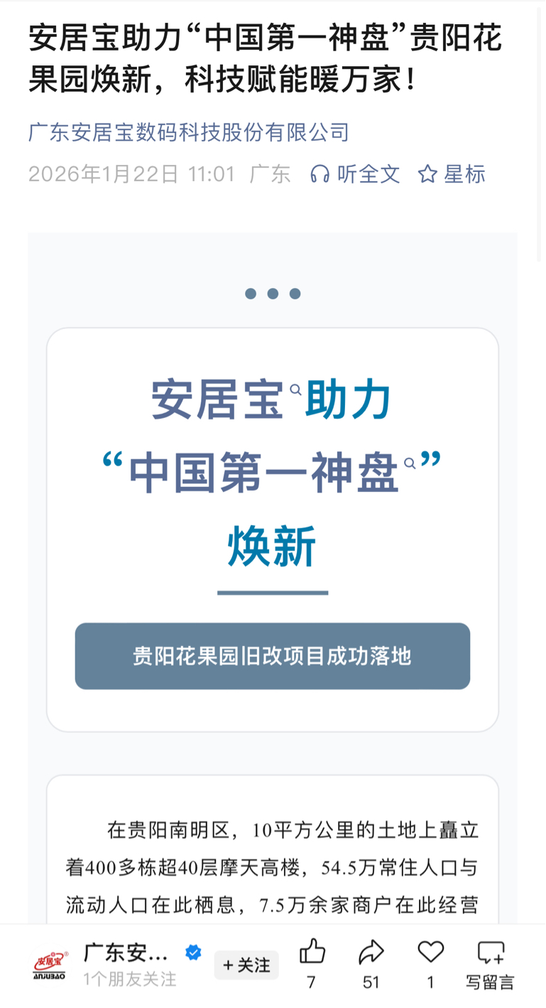 【安居宝】中标亚洲最大社区改造项目(贵阳花果园);同时受益深圳住建局1.23(周五)下午新发布的“人工智能 智慧城市升级”政策