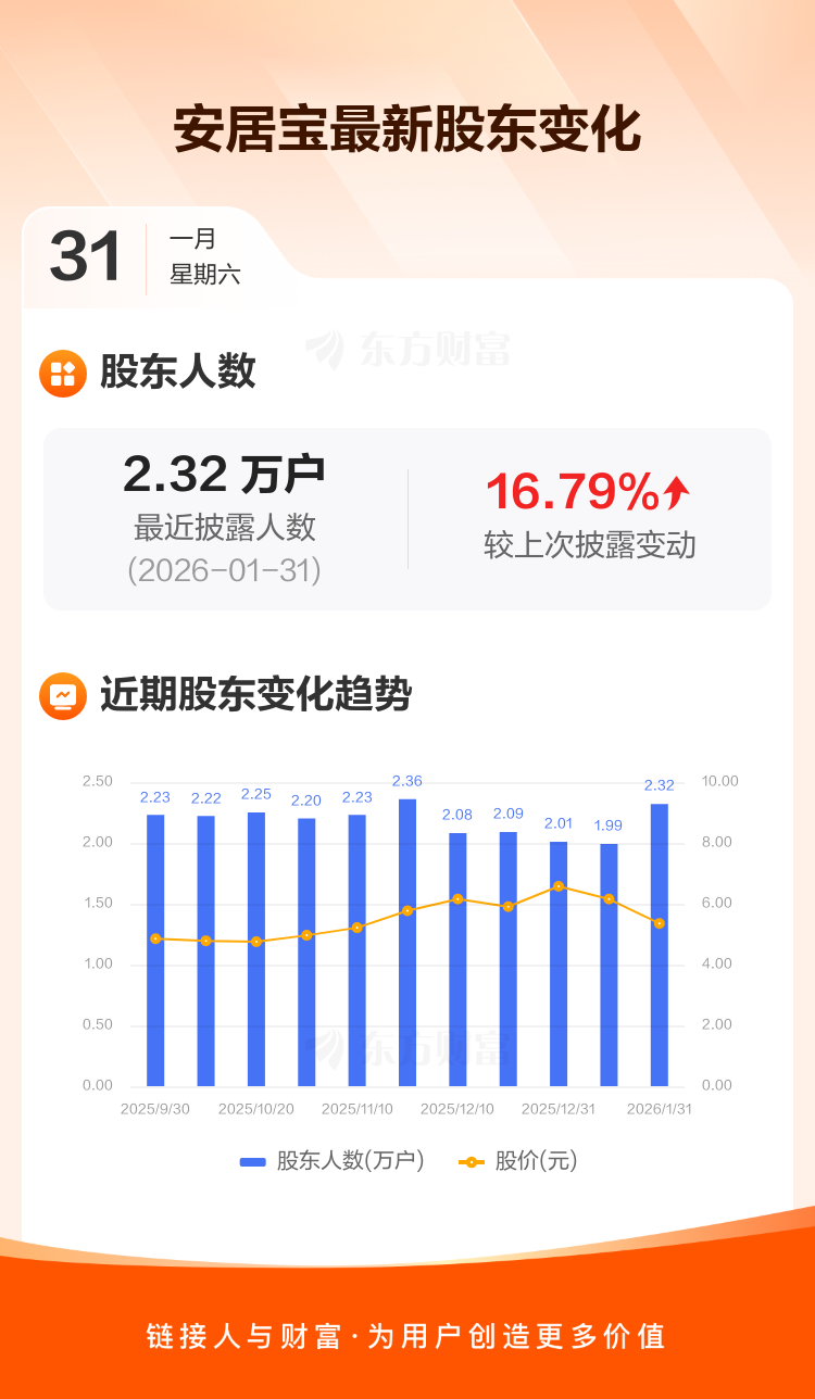 安居宝最新披露数据显示,截至1月31日公司股东户数为2.32万户,较上期(2026年1月20日)增加3334户,增幅为16.79%。户均持有流通股数量由上期的1.67万股下降至1.43万股,户均持股金额由上期的10.24万元减少至7.63万元。