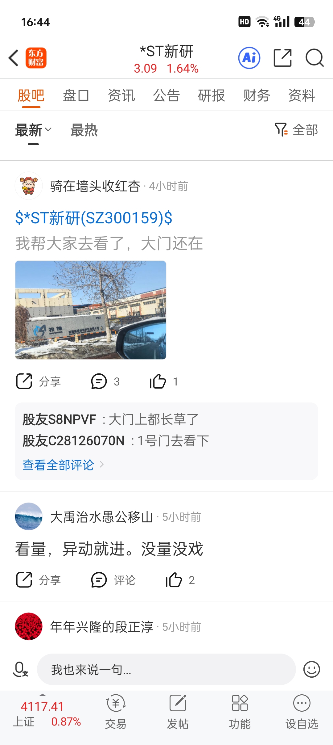 $*ST新研(SZ300159)$ 今天会有公告。骑在墙头收红杏。对本公司进行调研