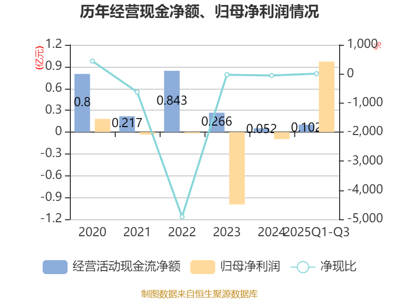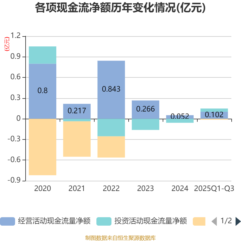 2025年前三季度,公司经营活动现金流净额为1016.3万元,同比下降50.66%;筹资活动现金流净额-128.87万元,同比减少128.87万元;投资活动现金流净额470.57万元,上年同期为-1544.02万元。
