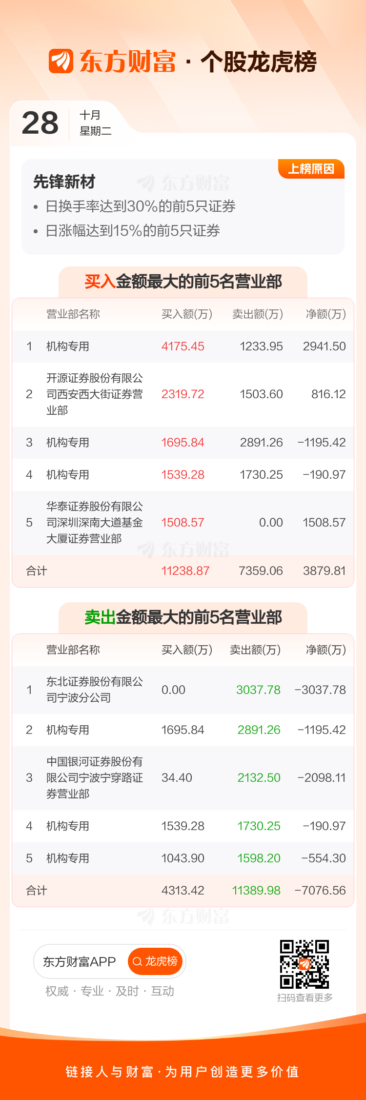 交易所2025年10月28日公布的交易公开信息显示,先锋新材因成为日换手率达到30%的前5只证券、日涨幅达到15%的前5只证券、连续三个交易日内,涨幅偏离值累计达到30%的证券上榜。先锋新材当日收报4.99元,涨跌幅19.95%,偏离值45.31%,换手率45.31%,成交额9.53亿。异常期间10月27日至10月28日,期间涨幅38.23%,累计偏离值36.67%,区间成交额16.04亿。