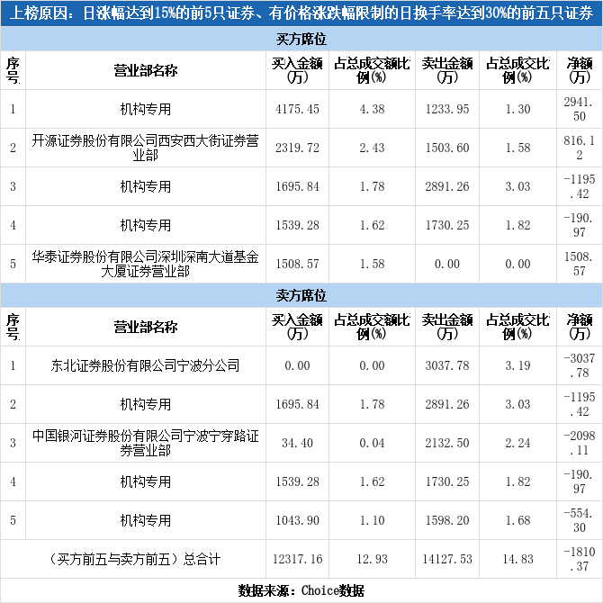 多主力现身龙虎榜,先锋新材涨停(10-28)