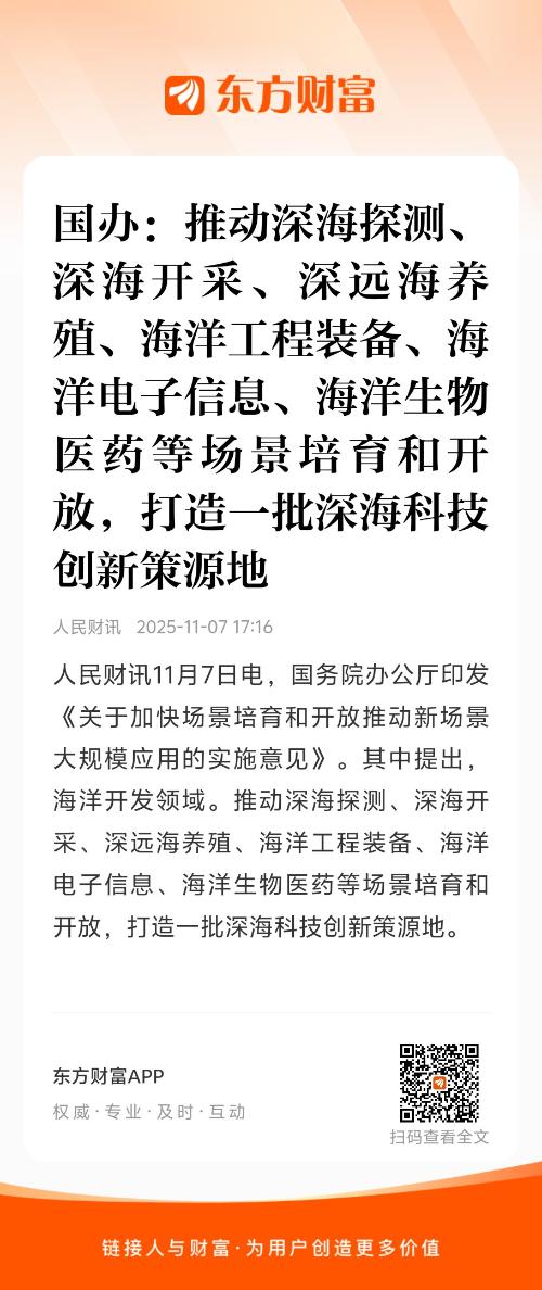 人民财讯11月7日电,国务院办公厅印发《关于加快场景培育和开放推动新场景大规模应用的实施意见》。其中提出,海洋开发领域。推动深海探测、深海开采、深远海养殖、海洋工程装备、海洋电子信息、海洋生物医药等场景培育和开放,打造一批深海科技创新策源地。