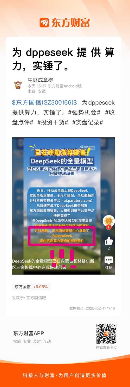 $东方国信(SZ300166)$  为dppeseek提供算力,实锤了。#强势机会#  #收盘点评#  #投资干货#  #实盘记录#
