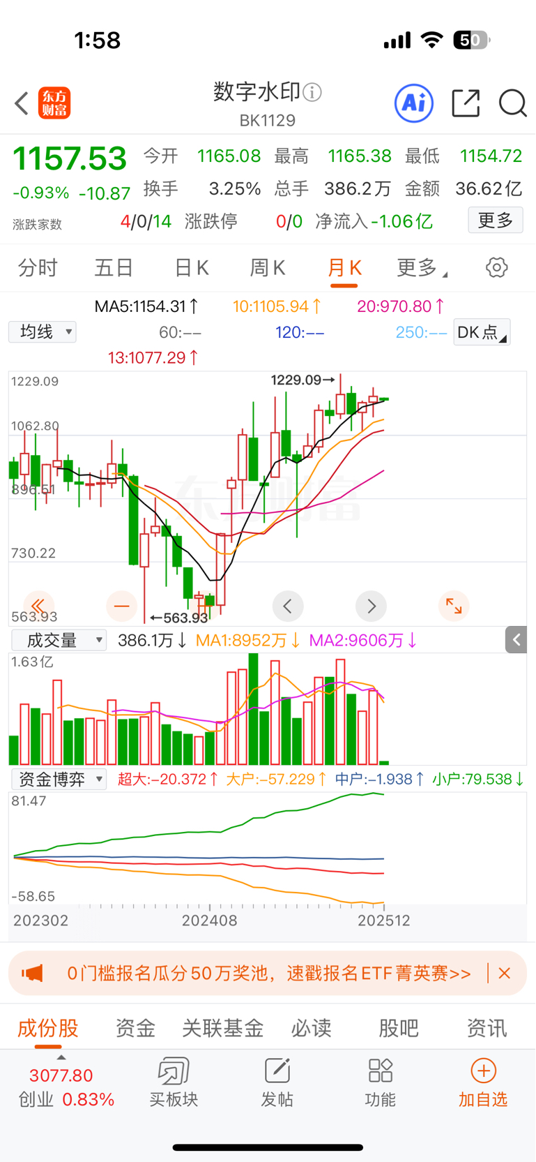 今天走势跟的数字水印,这么多题材涨一个不跟,哪个跌跟哪个,我看数字水印的月线也不