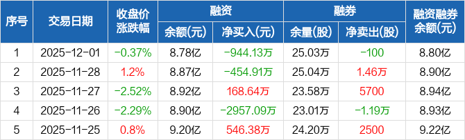 融资方面,当日融资买入3563.64万元,融资偿还4507.76万元,融资净偿还944.13万元。融券方面,融券卖出2.3万股,融券偿还2.31万股,融券余量25.03万股,融券余额273.08万元。融资融券余额合计8.8亿元。