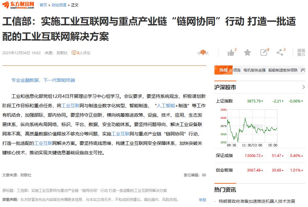 工信部:实施工业互联网与重点产业链“链网协同”行动 打造一批适配的工业互联网解决方案