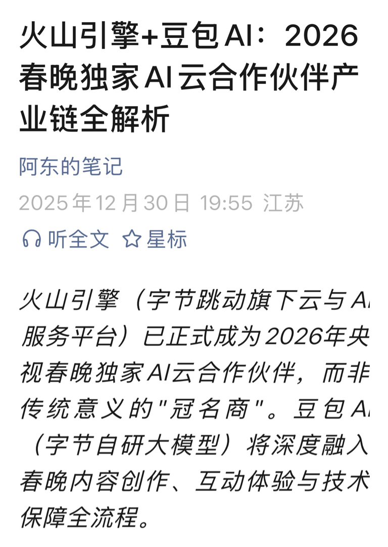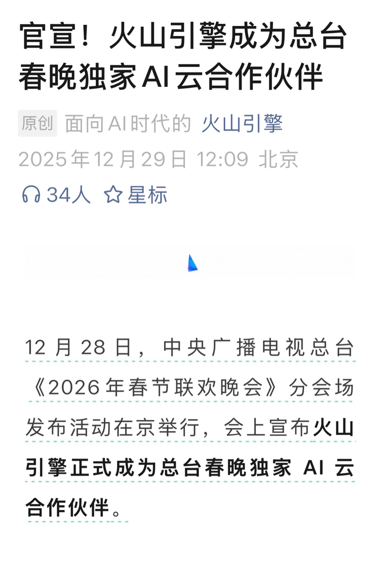 28日正式官宣了:火山引擎(字节跳动旗下云与AI服务平台)正式成为2026年央视春晚独家AI云独家合作伙伴 端