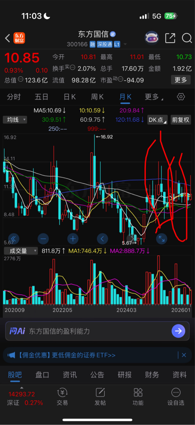 $东方国信(SZ300166)$ 如果不懂看看月线长上影以后至少要套两个月,高点逐渐降低,低点也在下移。买票只看概念不看前后今生不亏S你们