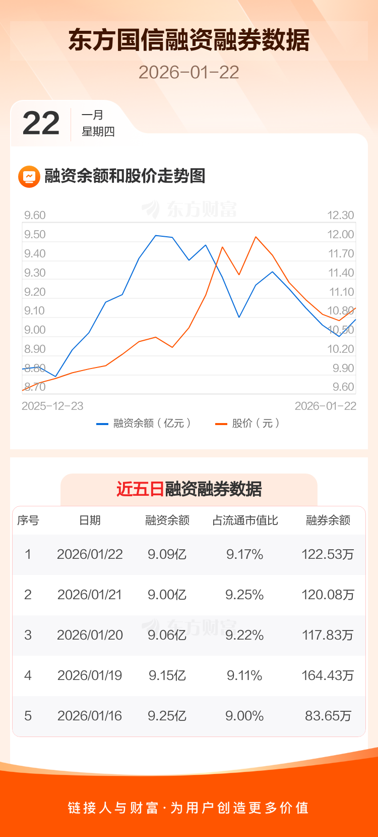 交易所最新数据显示,东方国信于2026年1月22日获融资买入4349.88万元,融资偿还3468.48万元,当日融资净买入881.4万元。目前,该股融资余额9.09亿,占流通市值比例为9.17%。