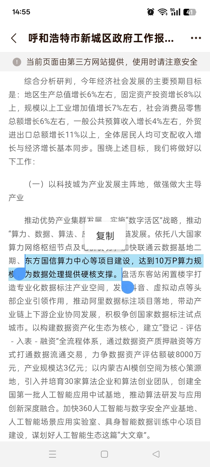内蒙古呼和浩特市新城区政府工作报告中明确:依托八大国家算力网络枢纽节点及电价优势