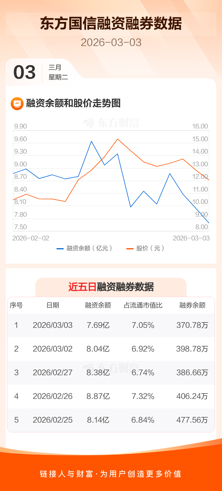 交易所最新数据显示,东方国信于2026年3月3日获融资买入1.03亿元,融资偿还1.39亿元,当日融资净偿还3533.78万元。目前,该股融资余额7.69亿,占流通市值比例为7.05%。