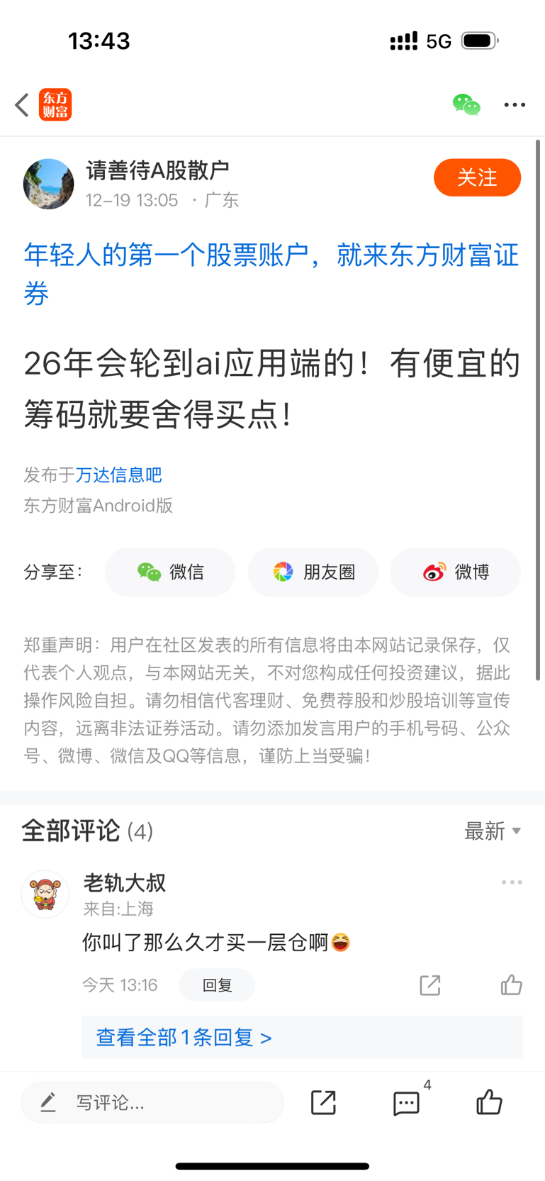 温馨提示: 1.根据《证券法》规定,禁止编造、传播虚假信息或者误导性信息,扰乱证券市场;2.用户在本社区发表的所有资料、言论等仅代表个人观点,与本网站立场无关,不对您构成任何投资建议。用户应基于自己的独立判断,自行决定证券投资并承担相应风险。《东方财富社区管理规定》