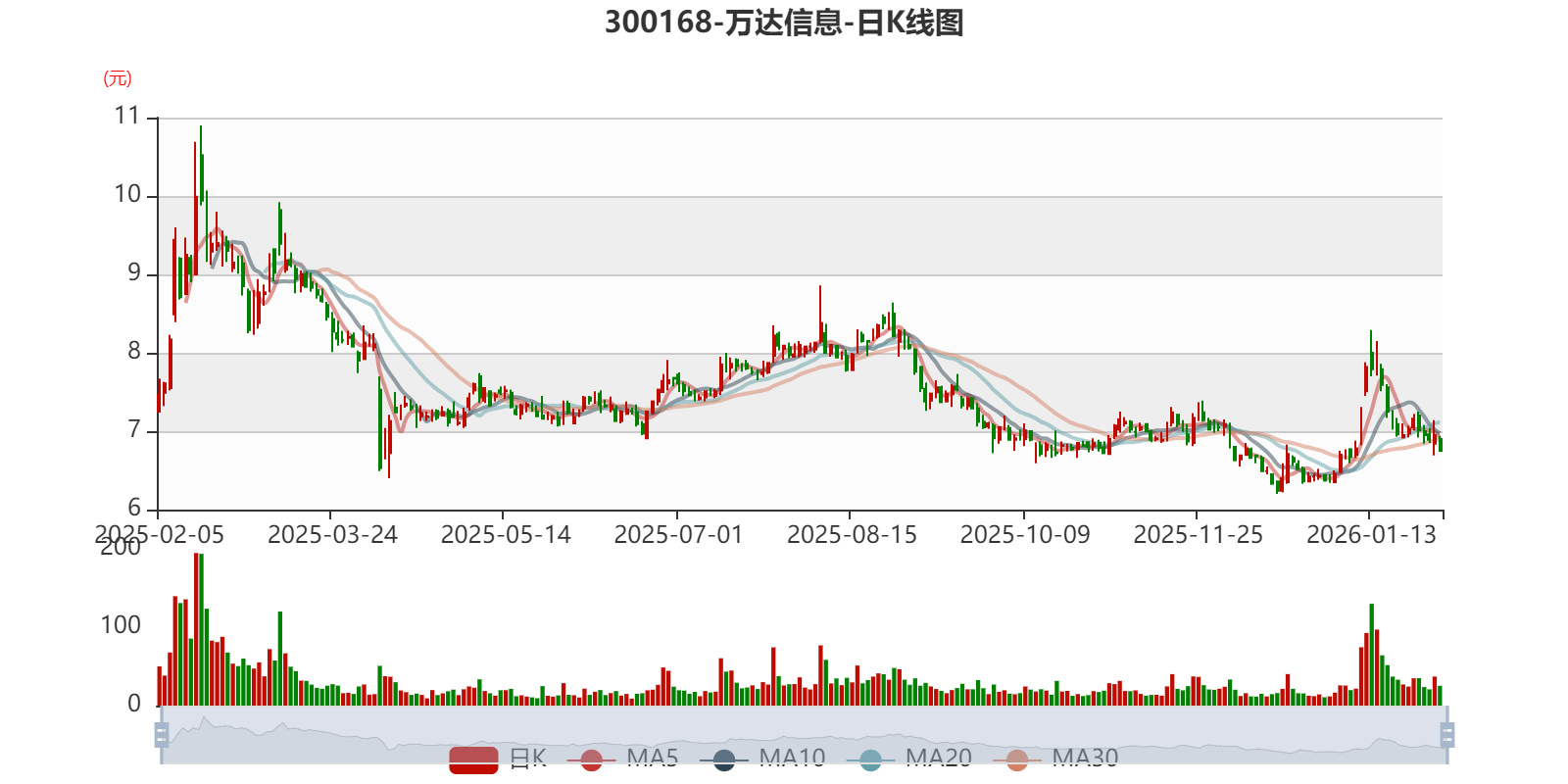 中证智能财讯万达信息(300168)1月30日晚间披露2025年度业绩预告,预计2025年实现营业收入19.5亿元至21.5亿元;归母净利润亏损5.25亿元至6亿元,上年同期亏损6.86亿元;扣非净利润亏损5.9亿元至6.85亿元,上年同期亏损7.71亿元。以最新收盘价计算,市净率(LF)约7.89倍,市销率(TTM)约4.74倍。
