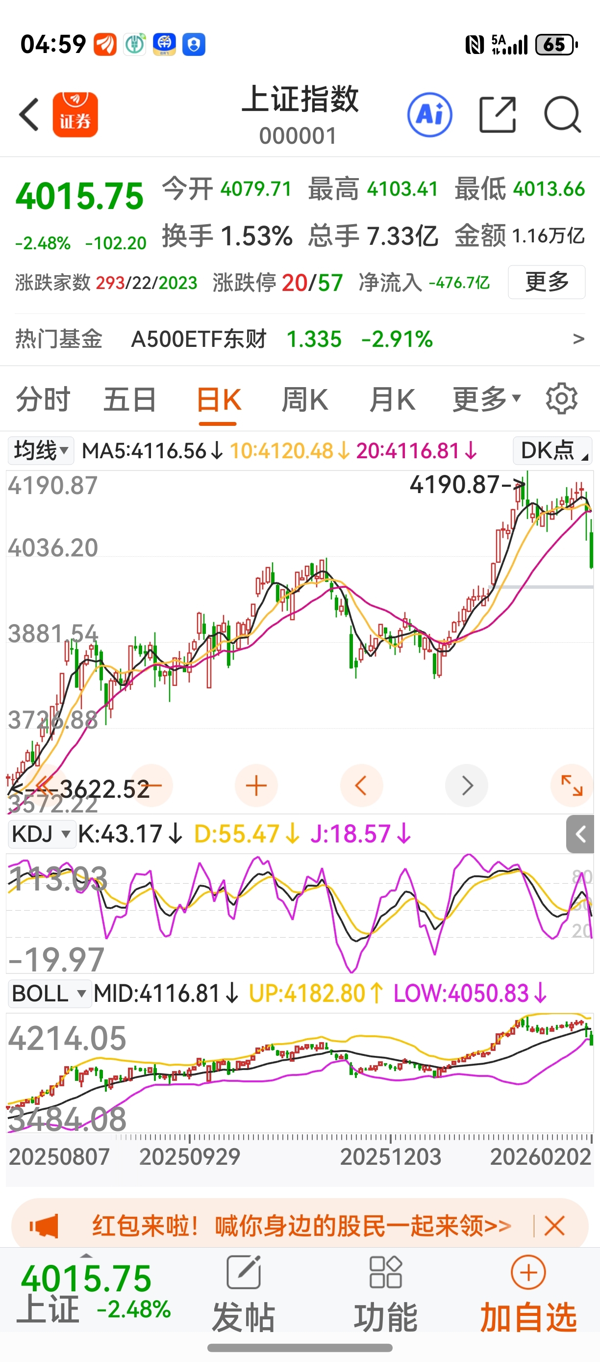 $万达信息(SZ300168)$ 哈哈兄弟们今天大盘因前期热闹的高位股加权重股的下杀,已经回调至星悦说的4千点附近了,明天的一个情绪杀大约3980点左右就可以止跌稳住了,今天的红盘票约7百只左右,下跌在负2左右的都是强于大盘,也可以定性为滞涨票,如果你的持仓票是红盘更好,这代表着现阶段属于强势票或热点票了,希望你坚持坚持再坚持!另外这次的下杀就是在为春节红包在做准备,(杀下来再涨回去年年如此)