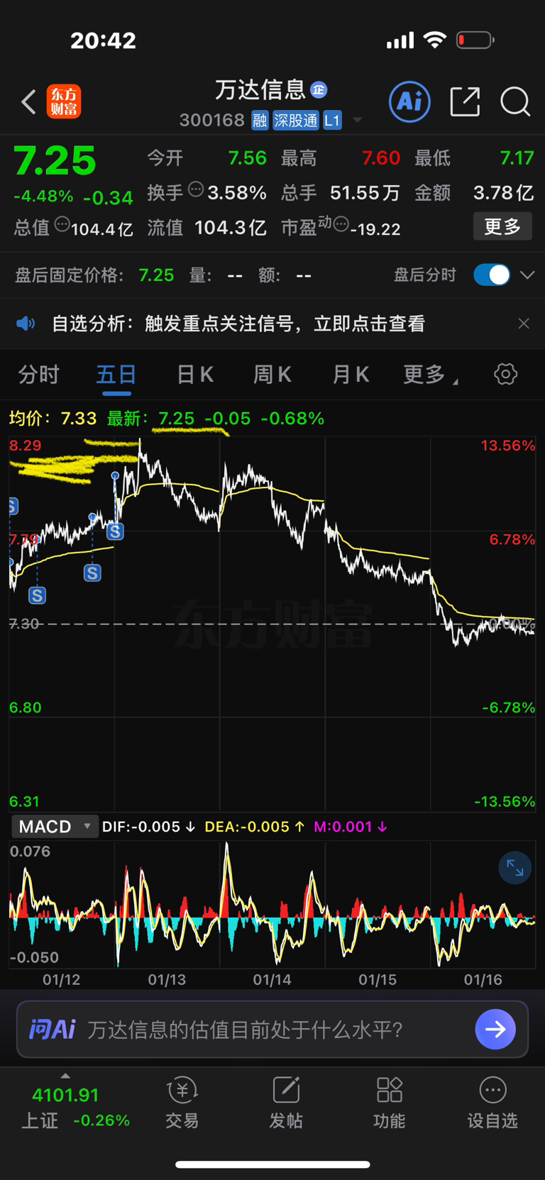 $万达信息(SZ300168)$ 卖对了,这只股我耿耿于怀,很少听别人建议买股,这是经济之声市场人士刘某说的,当时有上涨趋势,我的股票当时也涨的好,索性开一仓,果断进入几个交易日就被套了,最多套了25%,没怎么动,跌了那么多就开始T了,拉升最高卖了8.12元出来了,不要听别人买股是纪律