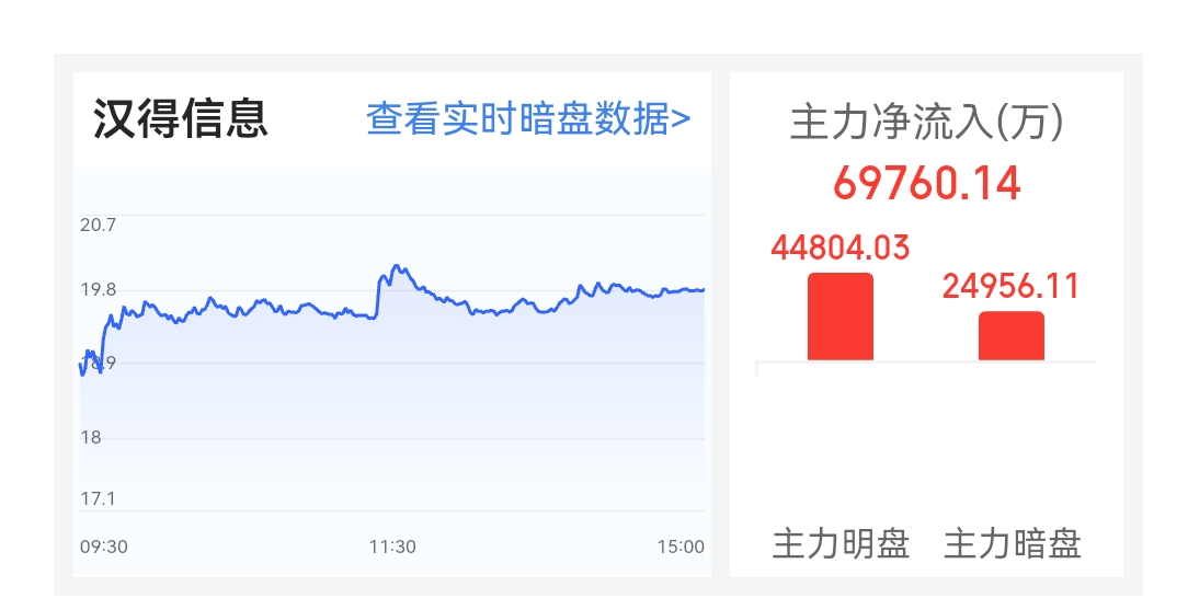 $汉得信息(SZ300170)$ 暗盘资金流入分享