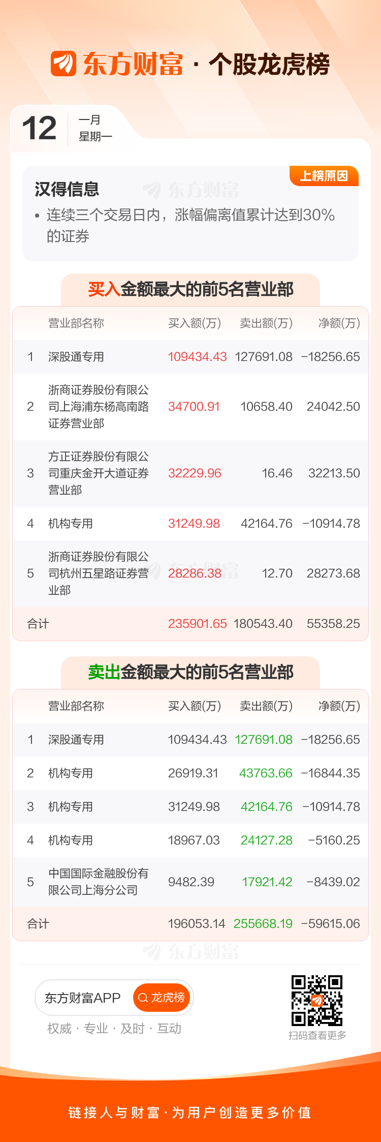 交易所2026年1月12日公布的交易公开信息显示,汉得信息因成为日涨幅达到15%的前5只证券、连续三个交易日内,涨幅偏离值累计达到30%的证券上榜。汉得信息当日收报29.39元,涨跌幅20.01%,偏离值20.00%,换手率27.66%,成交额73.88亿。异常期间1月8日至1月12日,期间涨幅46.95%,累计偏离值42.42%,区间成交额205.03亿。