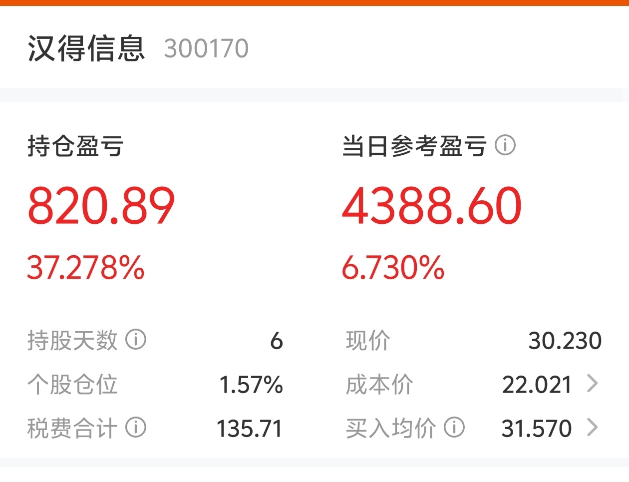 $汉得信息(SZ300170)$ 昨天重仓1200股。我还以为今天要死。幸好跑得快,没挂山顶上,最后还盈利820,今天挂山顶上的兄弟们多不多