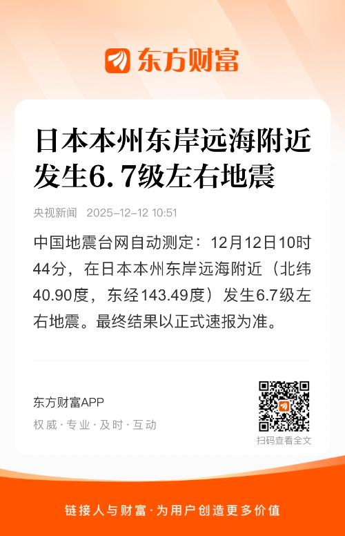 中国地震台网自动测定:12月12日10时44分,在日本本州东岸远海附近(北纬40.90度,东经143.49度)发生6.7级左右地震。最终结果以正式速报为准。