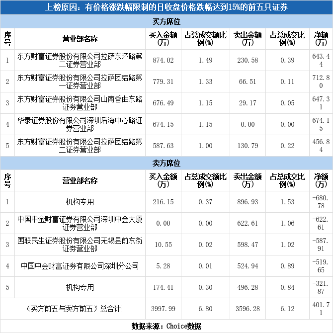 深交所2025年12月23日交易公开信息显示,ST福能因属于有价格涨跌幅限制的日收盘价格跌幅达到15%的前五只证券而登上龙虎榜。ST福能当日报收4.49元,涨跌幅为-17.01%,换手率18.13%,振幅7.39%,成交额5.88亿元。