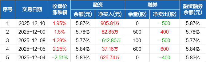 融资方面,当日融资买入3981.2万元,融资偿还3075.39万元,融资净买入905.81万元。融券方面,融券卖出0股,融券偿还500股,融券余量0股,融券余额0元。融资融券余额合计5.87亿元。