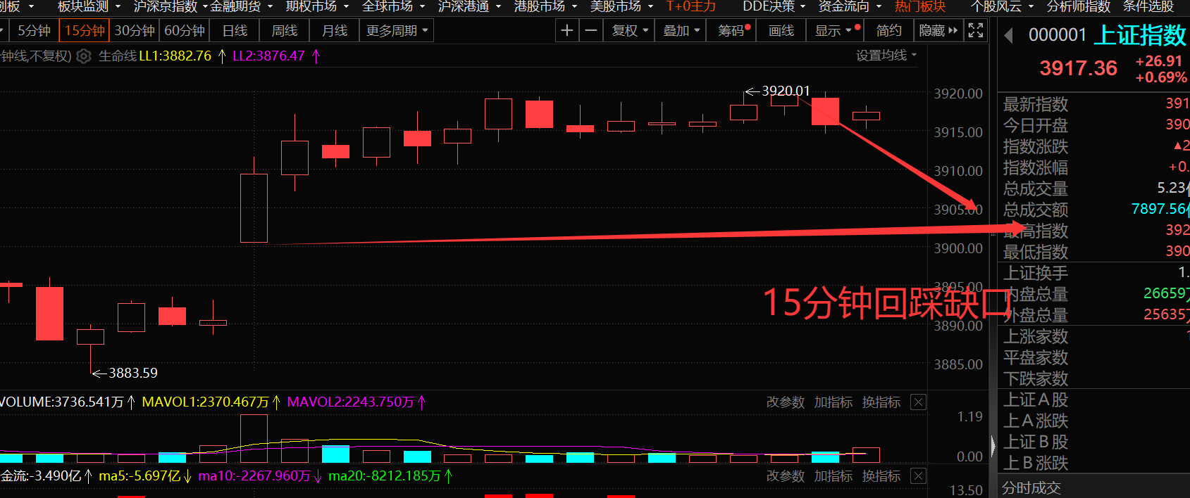 昨天的市场走出了久违的“大科技与题材共振”的上涨行情。三大指数全线上扬,创业板指表现尤为强势。市场交投情绪显著升温,沪深两市合计成交额放大至1.86万亿元,较前一交易日激增超1360亿元。今天要小心15分钟周期的回调,毕竟连续两天大涨,今天难免降温。