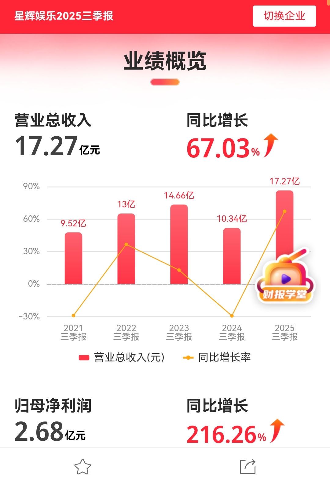 星辉娱乐三季度营业收入同比增长67%,净利润同比增长216.26%,每股收益0.22,去年同期是 -0.19,增长非常大,这也是我卖出中海达买入星辉娱乐的原因。