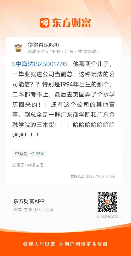 $中海达(SZ300177)$ 他那两个儿子,一毕业就进公司当副总,这种玩法的公司能信??特别是1994年出生的那个,二本都考不上,最后去英国弄了个水学历回来的!!还有这个公司的其他董事、副总全是一群广东商学院和广东金融学院的三本货!!!哈哈哈哈哈哈哈哈哈!!!