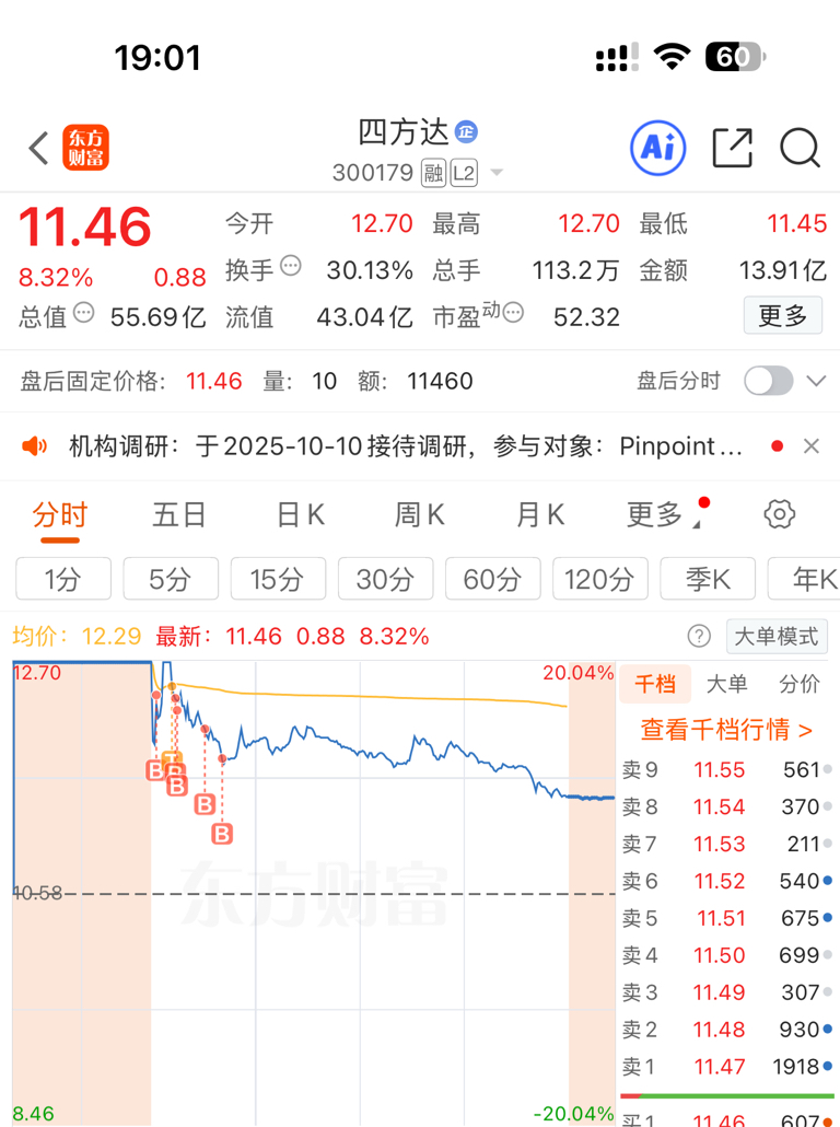 $四方达(SZ300179)$ 请问 我就是问问有没有涨停进来的 早上的涨停我没卖掉 不小心12.4又买了很慌张 然后又封停了 60w封的 有没有五分钟又开了 绝了 想过走低没想到这么低 不过这个股一直很水之前