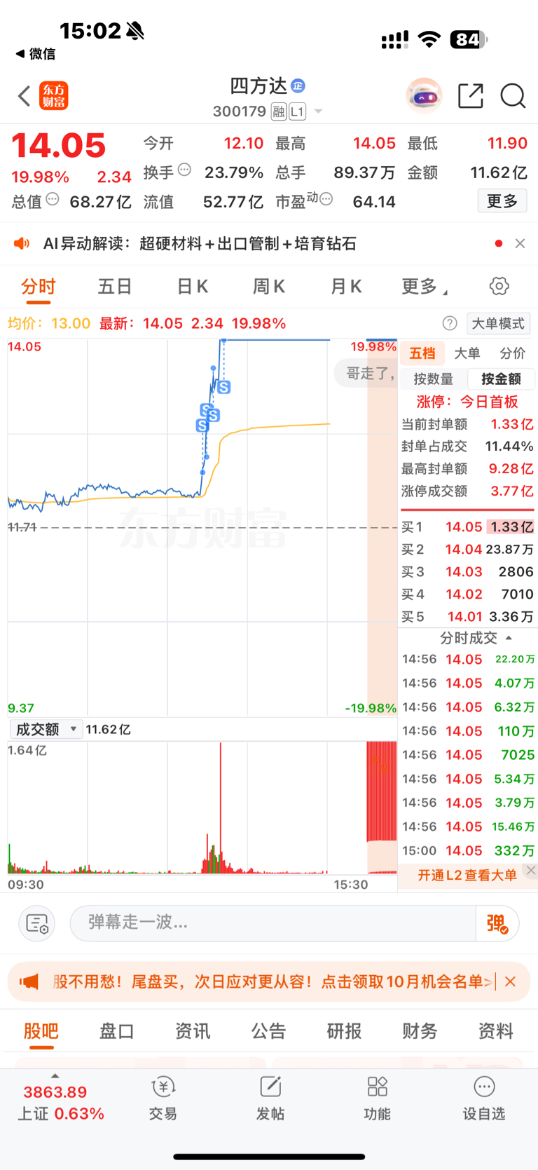 $四方达(SZ300179)$ 各位今天都大赚了吧,再见,涨停板夹心汉堡包,冲板超大单,后面包了许多小碎单。老龙头力量不上板还是有点困惑的。安全第一,不贪心。