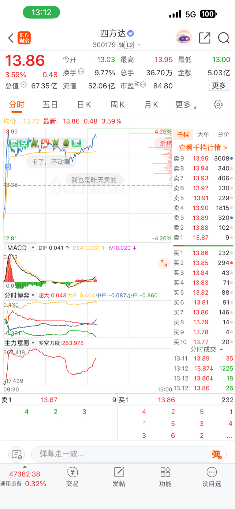 $四方达(SZ300179)$ 你不用在我卖出的价格附近这里诱,我早盘卖了就不会盘中再买,等尾盘我会去别的科技股,你爱咋咋滴,欧力给