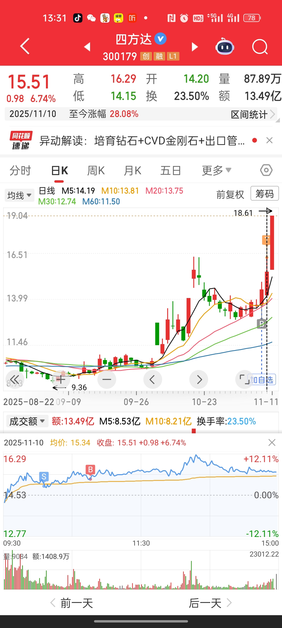 $四方达(SZ300179)$ 昨日下杀把我洗出去了!很是气愤,分时低点又接回来了,果然没让我失望!