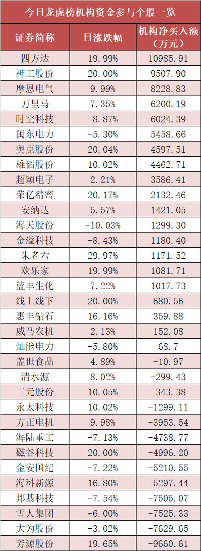 盘后龙虎榜数据显示,机构现身多股,其中四方达等股票呈现机构资金净买入,芳源股份等股票呈现机构资金净卖出。