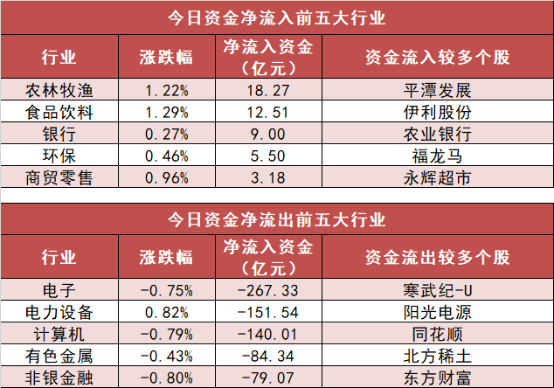 申万一级行业中,6个行业实现资金净流入,其中农林牧渔行业净流入18.27亿元居首。