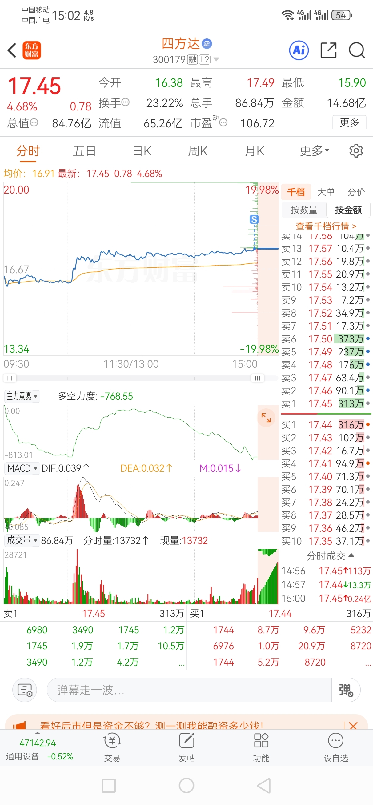 $四方达(SZ300179)$ 我擦 挂17.44被吃了,厉害了 不来不想卖的