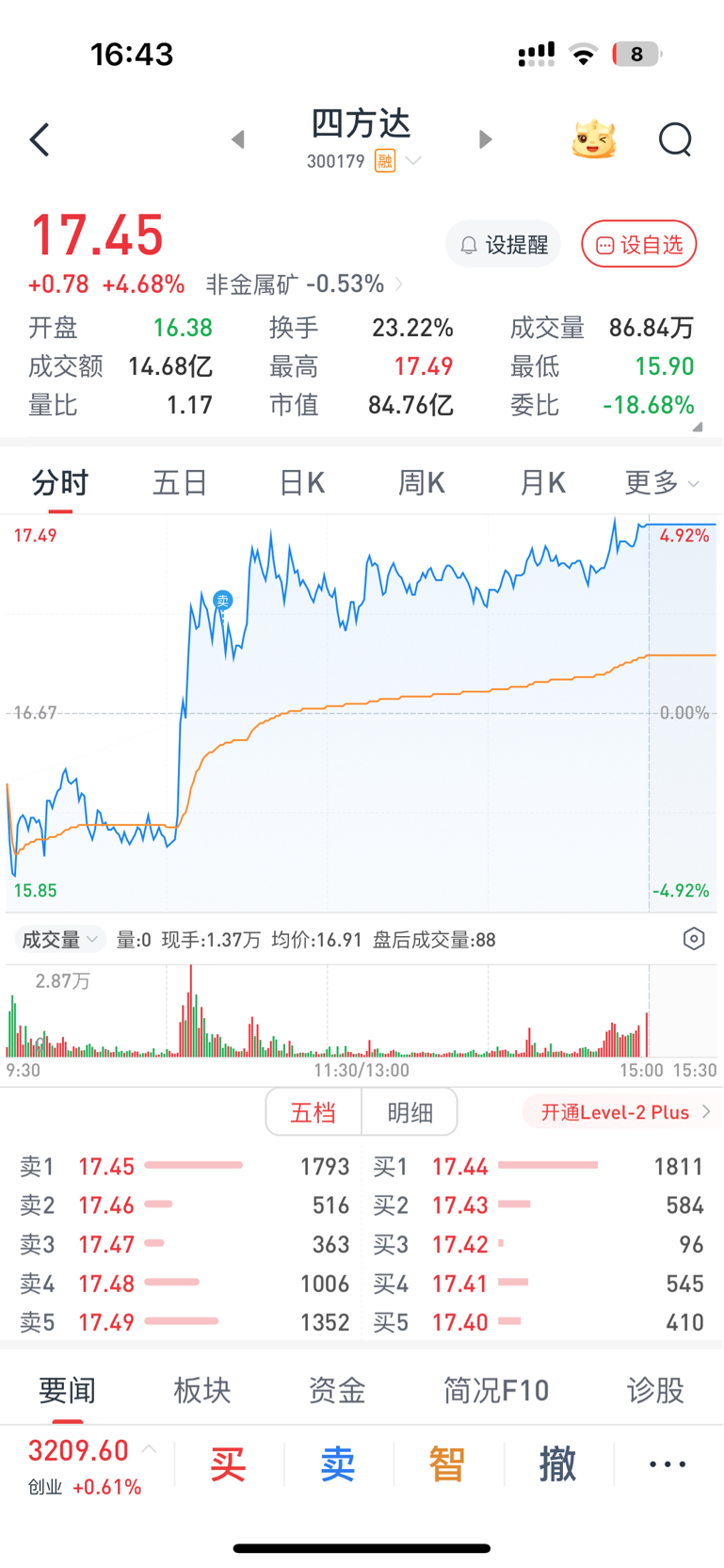 $四方达(SZ300179)$ 早上差点割肉出来,赚点饭钱走了